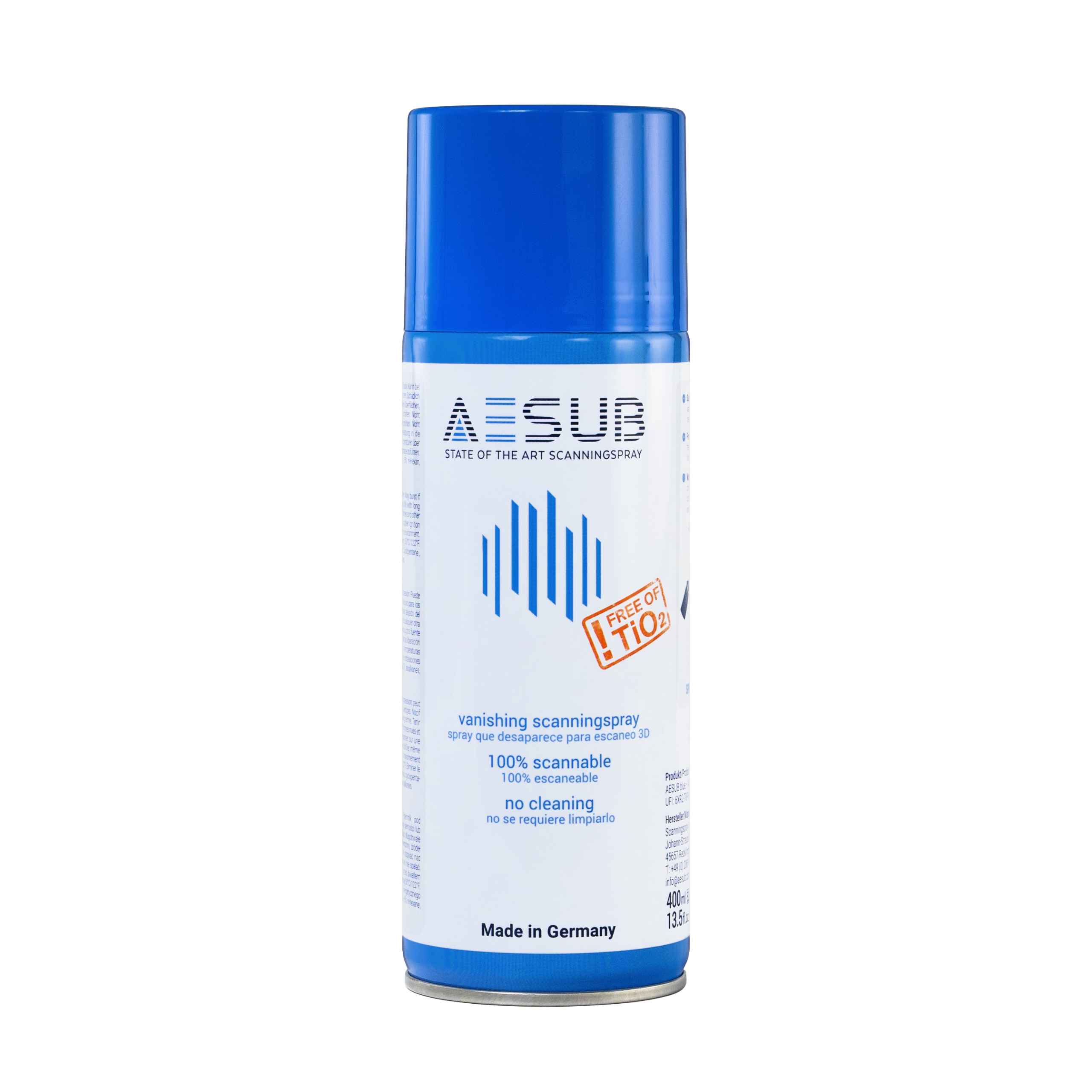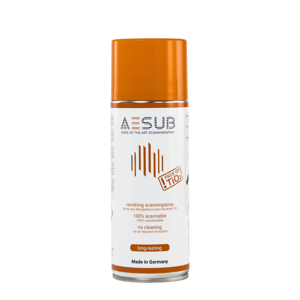 AESUB blue eignet sich ideal für schnelle und saubere 3D-Scans ohne zusätzlichen Reinigungsaufwand. Die weiße, pigmentfreie Beschichtung sorgt für eine gleichmäßige Mattierung und verflüchtigt sich nach dem Scan selbstständig. Damit ist das Spray besonders gut für tägliche Standard-Messaufgaben geeignet.