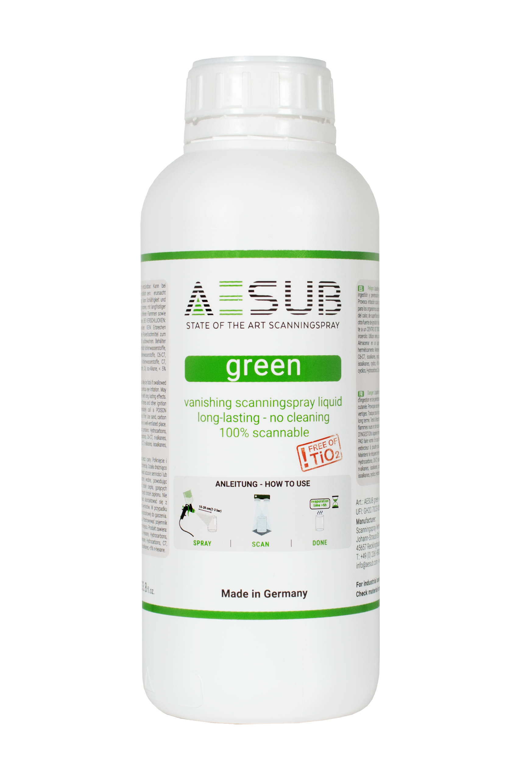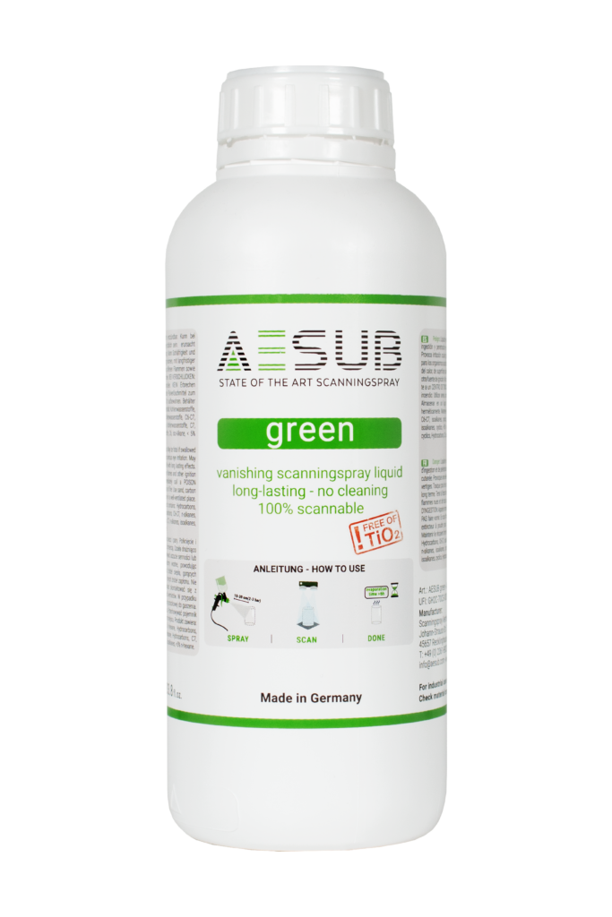 AESUB green ist ein selbstverflüchtigendes 3D-Scanningspray als Gebindelösung und eignet sich besonders für großflächige sowie automatisierte Scanprozesse. Die pigmentfreie Beschichtung sorgt für eine gleichmäßige Mattierung und verschwindet nach dem Scannen rückstandslos. Ideal für Anwendungen mit Sprühpistole, bei denen Effizienz und Reproduzierbarkeit im Vordergrund stehen.