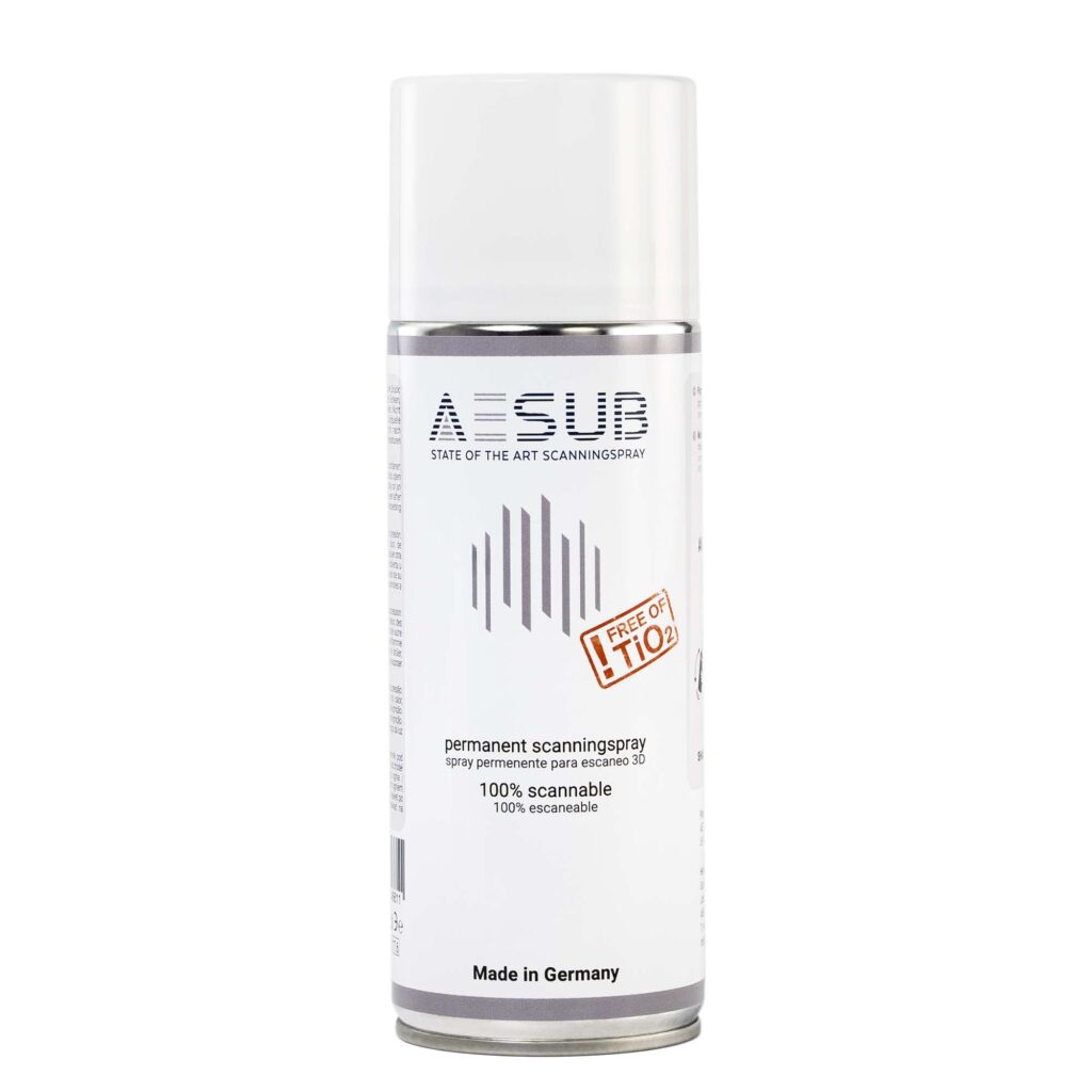 AESUB white ist ein permanentes 3D-Scanningspray, das eine sehr gleichmäßige, matte Oberfläche für zuverlässige Scanergebnisse erzeugt.