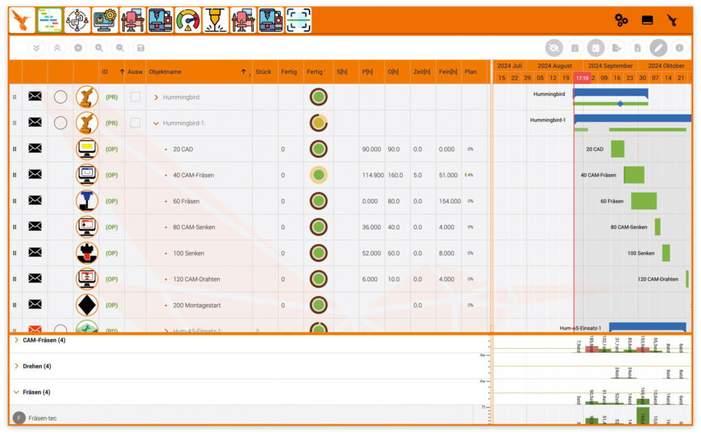 Bereits während der Planung können Dokumente hinterlegt und Ressourcen zielgerichtet zugewiesen werden. Die Planung basiert auf der Echtzeit-Kapazitätsauslastung der digitalen Arbeitsplätze und berücksichtigt Maschinendaten aus der Hummingbird Maschinendatenerfassung.